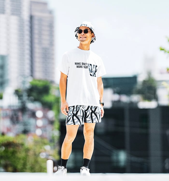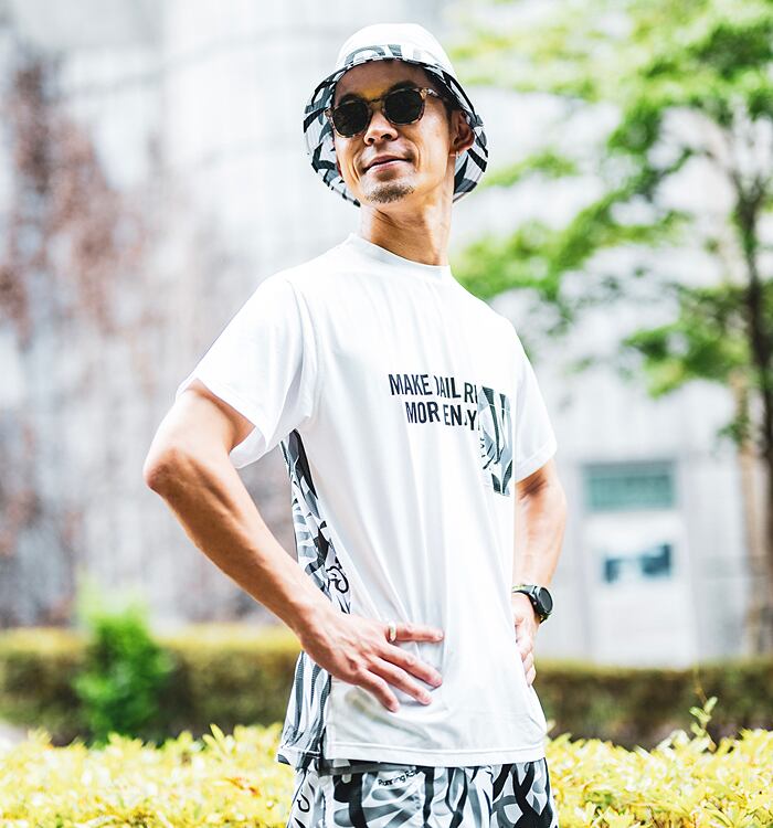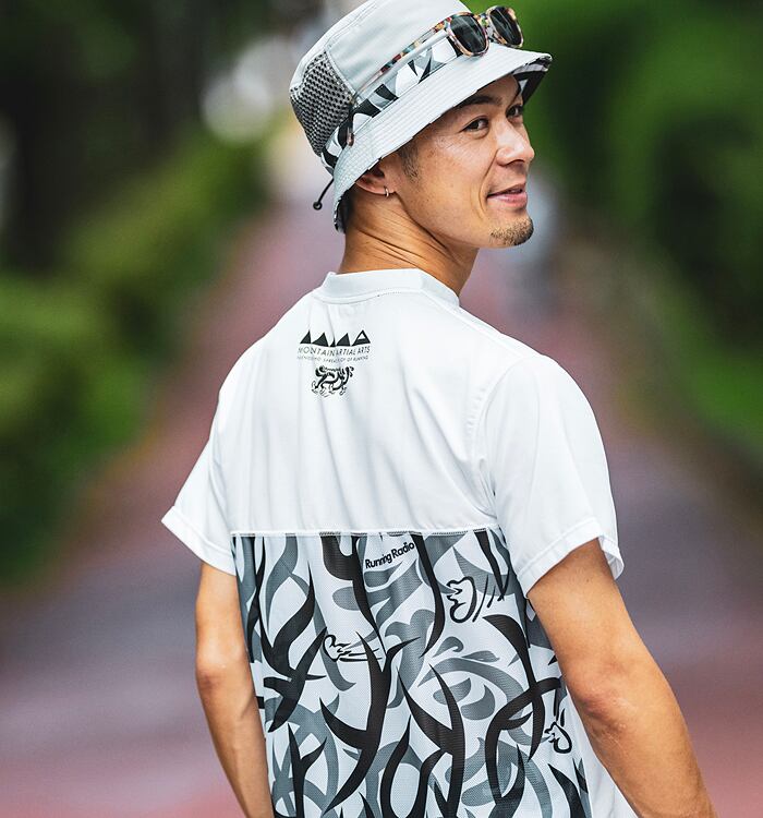 ランニングイベントのMCや、PODCAST「ランラジ」のパーソナリティとして人気を集める岡田拓海さん(タクミくん)とのコラボレーションTシャツ。フルマラソンでサブスリーを達成し、100マイルトレイルも走破する確かな実力を持ちながら、明るいキャラクターでランニングの楽しさを発信しているタクミくん。その「ランラジ」ロゴをトライバルカモにアレンジし、背中を吸水速乾メッシュで切り替えた特別仕様のポケットTシャツです。