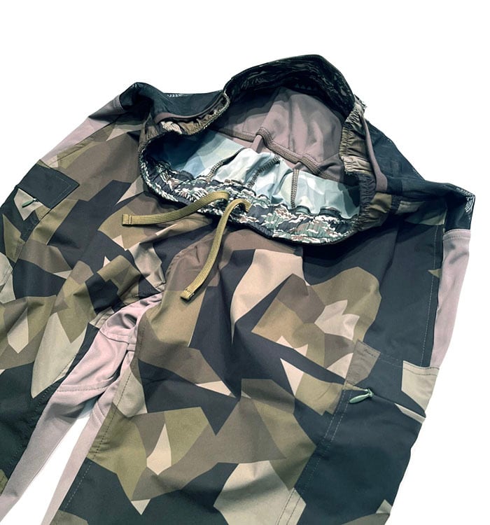 本体素材には2種類の東レ Primeflex®を使用。風の当たる前面は撥水性と2wayストレッチ性を備えた軽量素材、背面はよりしなやかな吸水速乾ストレッチ素材です。前面にはオリジナルカモフラージュを昇華転写プリントで表現し、アクティビティ時だけでなくアフターシーンにも馴染むデザインに仕上げています。軽量で携帯性も高く、幅広いシーンで活躍する、MMAのスタンダードプロダクトです。
