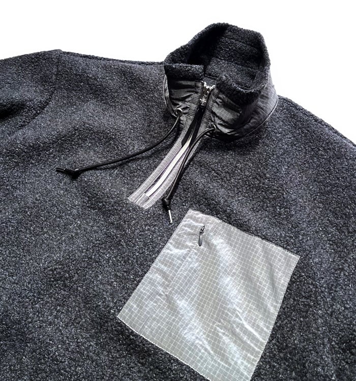 本作は、イタリアで150年以上にわたりウールリサイクルを続けてきた老舗「CALAMAI」社の再生ウールを採用した、クラシカルなデザインのプルオーバー。日本製のオリジナルボディは、ナチュラルショルダーで肩幅と身幅にゆとりを持たせたリラックスシルエットに仕上げています。胸元のハーフファスナーにより体温調節がしやすく、襟元・ポケットカバー・袖口には高強度の撥水モノフィラメントリップストップナイロンを配置。耐久性の向上とともに、デザインのアクセントとしても機能します。