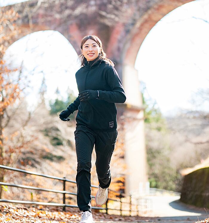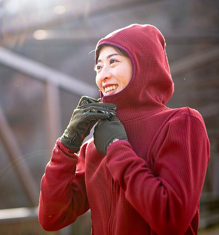 日本製のオリジナルボディは、アクティブな動きに適したシルエット。フロントは軽量コイルファスナーの逆開タイプで、上下から開閉でき、脱ぎ着や体温調整がスムーズです。フードと袖先は肌触りの良いテープバインダーで補強し、縫製部分をフラットにすることで快適な着心地を実現しました。