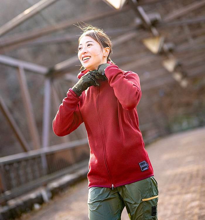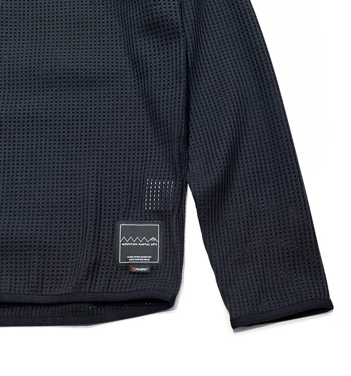 本体素材には、アウトドアシーンで信頼されるPOLARTEC®の新開発「Power Dry Net Mesh」を使用。Power Dry独自の高い吸収力に加え、汗を素早く拡散・蒸発させる機能を維持しつつ、ネット状メッシュ構造により優れた通気性を確保。中肉厚による適度な保温性と高い通気性を兼ね備え、秋から初春にかけて一枚でも、シェルとのレイヤリングでも活躍。ベースレイヤーとミッドレイヤーの両方を担う、新たなポジションを開拓する一着です。