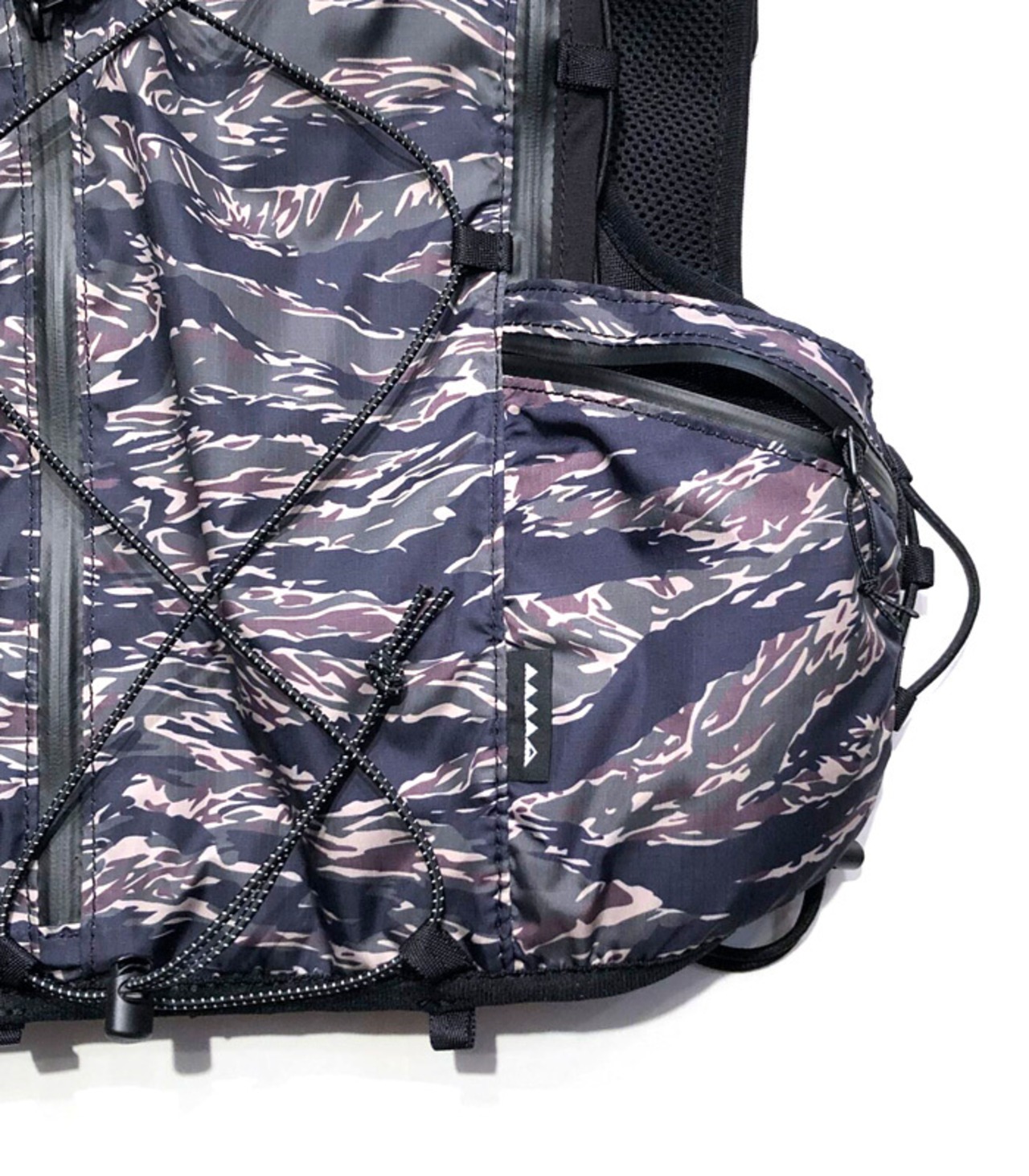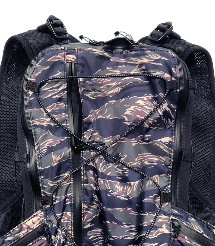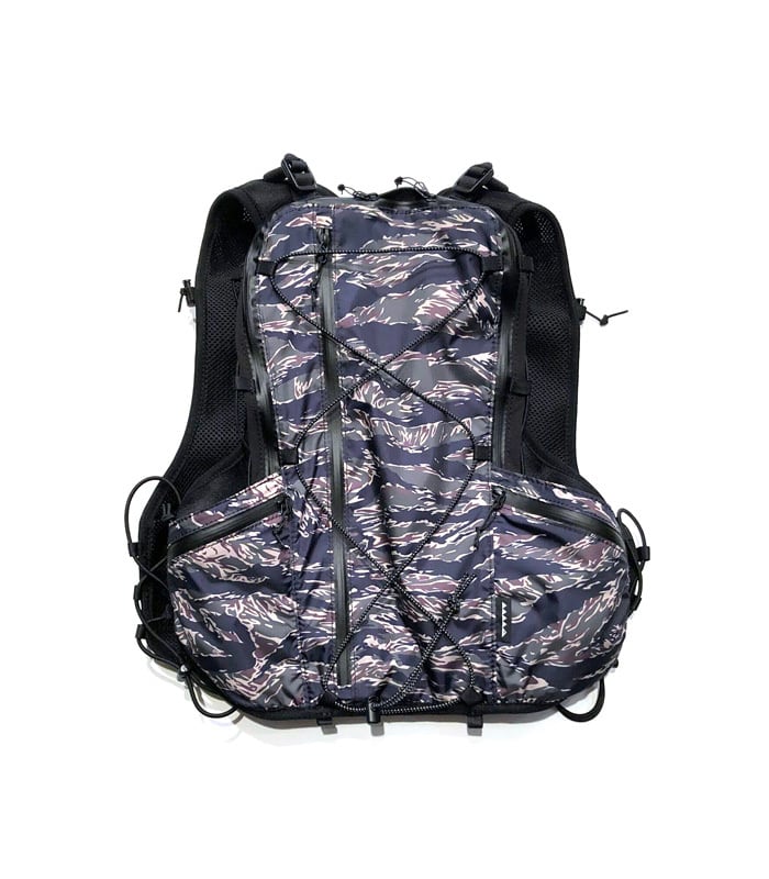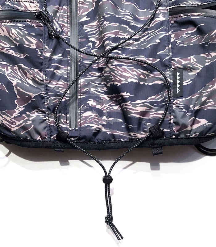 撥水加工を施した軽量リップストップ素材に、ブランドらしいタイガーカモを昇華転写プリント。ハニカム構造のダブルラッセル素材をベースに使用することで、通気性と速乾性に優れ、長時間のアクティビティでも快適さをキープします。