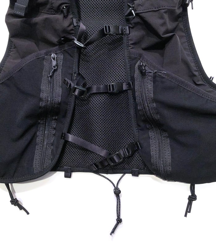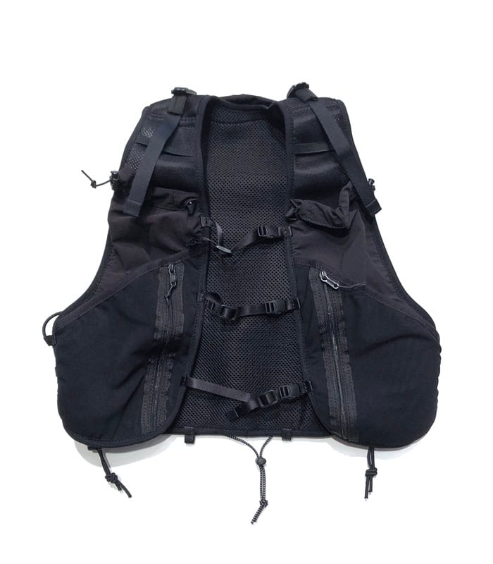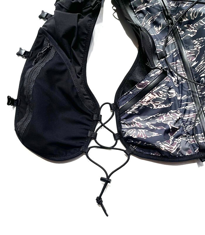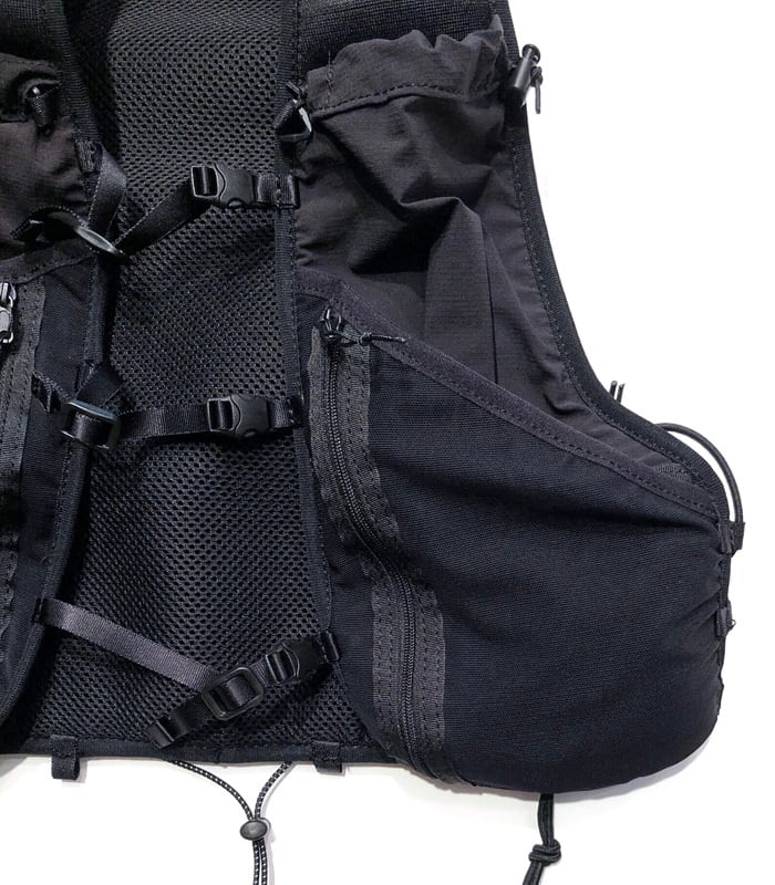 逆台形構造のメインコンパートメントは最大約8Lの容量で、レースの必携装備を効率よく収納可能。フロントポケットやサイドのドローコード、ボトルホルダー、各種メッシュポケットなど、行動中のアクセス性と収納力にも優れています。